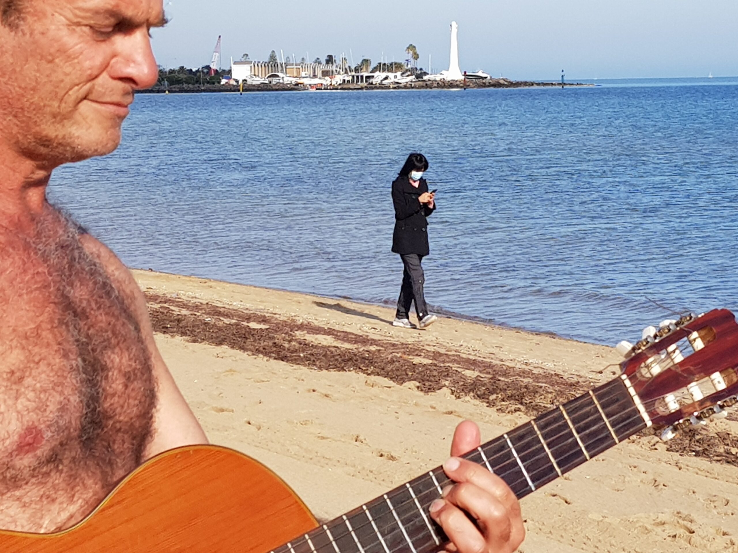 I took this photo below of one of our winter-swim group playing his guitar just before a swim in Port Philip Bay, Melbourne. In the background — a masked woman walks on the open beach viewing her phone. This was taken a week before the government mandated the wearing of masks in Melbourne.