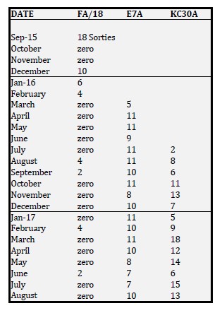 The FA18 is a fighter jet and as the figures show, has barely been used. The E7A is a different story. This plane is an electronic eye in the sky and provides essential support for the bombers, primarily American, to aim at their targets. Those targets, as has been amply documented, have resulted in heavy civilian casualties, as well as units of the Syrian Arab Army.