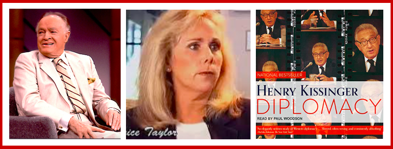 Brice had two bosses, the comedian Bob Hope (1903-2003) and former US Secretary of State Henry Kissinger (b 1923, now age 98). She claims to have been used by Kissinger in two ways. First, to deliver messages to political leaders, often by using her sexual skills to soften the guy up so they would be interested in her message. Second, to act as a living “USB” for Henry. Her brain had mind files stored in it which he could tap, at meetings, to deliver, say, information about US weaponry.