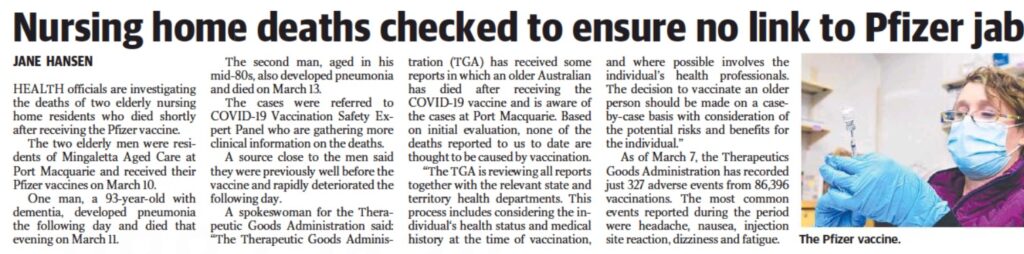 Someone from the Informed Medical Options Party (IMOP) in Australia live-streamed a video on Facebook to talk about the deaths, and how the Sunday Telegraph buried the story on page 21. He states that if they had died from COVID, it would have been headline news and prompted more lockdowns.