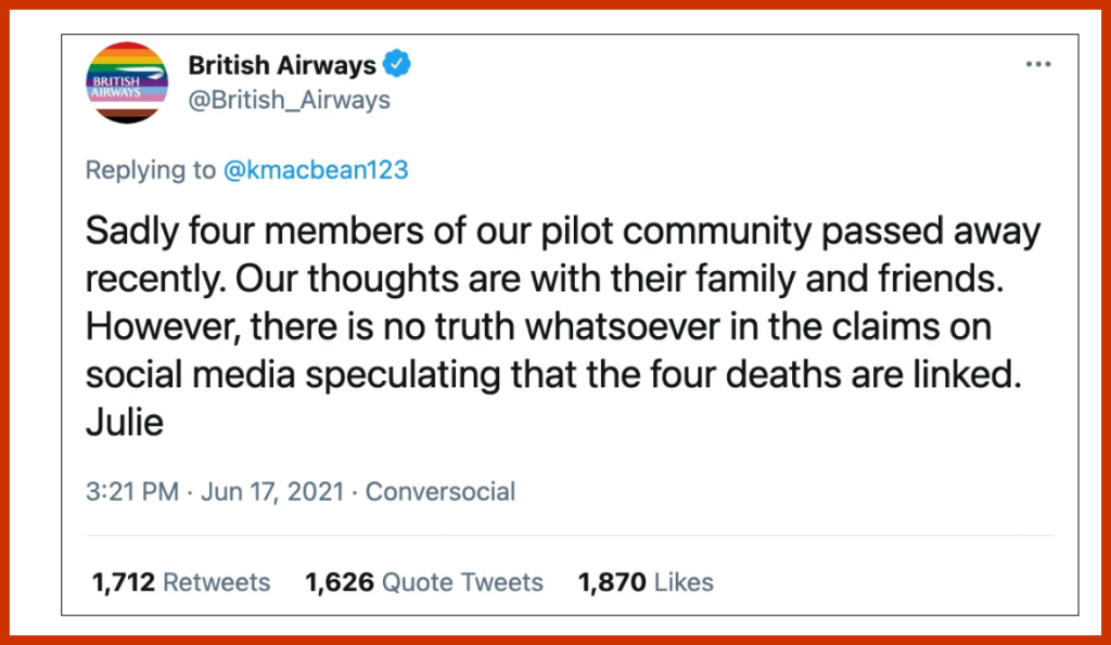 But in the American Conservative Movement blog their article entitled, “British Airways Coverup: Four Pilots Dead in One Week But Airline Obfuscates on Vaccine Connection”, they write, “One needs only look closely at the wording of statements and oftentimes the subsequent fact-checks to see when a coverup is in process. Such is the case with British Airways and their claims that four pilots who have died in one week are not ‘linked’.”