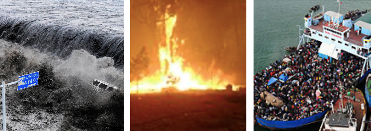 Tsunami in Japan 2011 (20,000 died); Bushfire in Australia 2009 (173 died); Earthquake in Haiti 2010 (150,000 died): photo of homeless being ferried out of Port au Prince