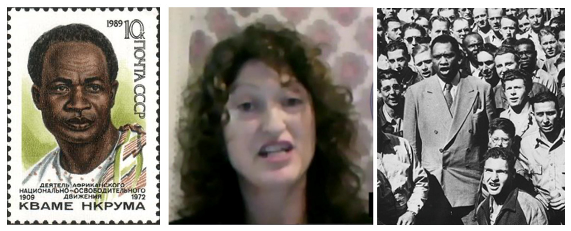 (L) Kwame Nkrumah (1909-1972), on a Soviet Union postage stamp (C) Rachel Vaughan, speaking to the ITNJ in 2019 (R) Paul Robeson (1898-1976) singing with workers