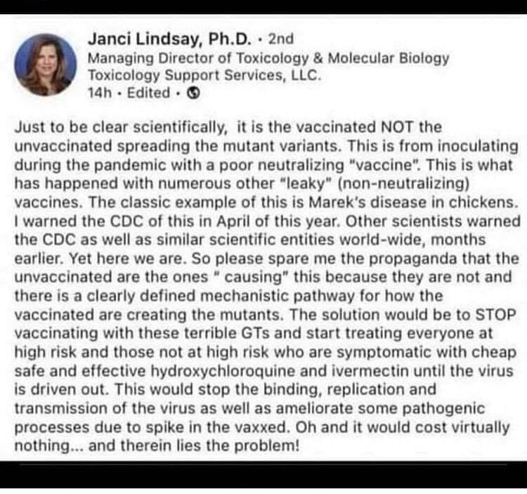 And a message from Janci Lindsay Ph.D has been across the internet. “…it is the vaccinated NOT the unvaccinated spreading the mutant variants… So please spare me the propaganda that the unvaccinated are the ones ‘causing’ this because they’re not…”