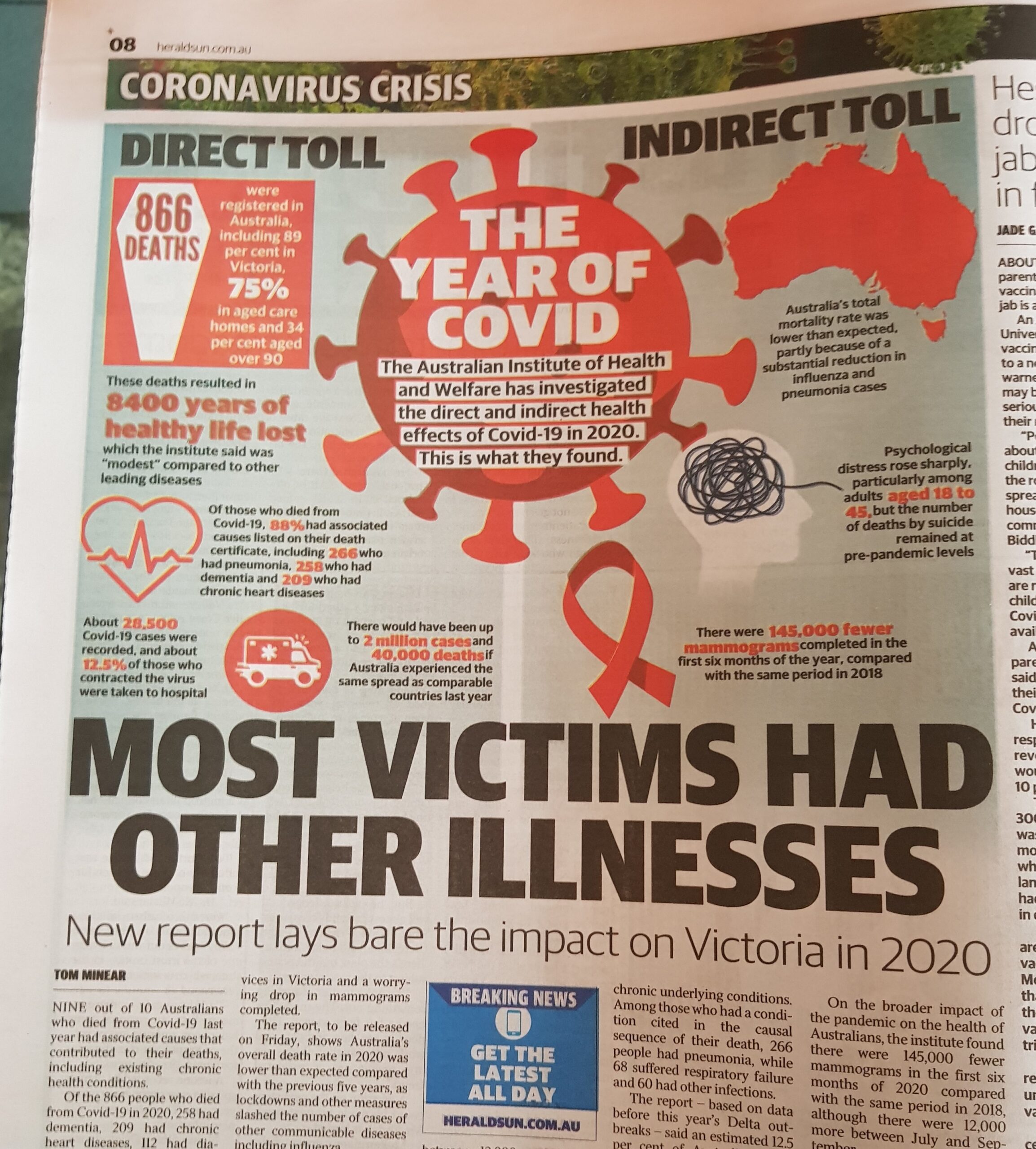 Paging through the Herald Sun this morning I found this article. It reveals that at least 90% of those that died from Covid-19 in the State of Victoria last year had serious co-morbidities. We knew that then, but this information is only “released” to the public AFTER the rollout and acceptance of vaccine passports.