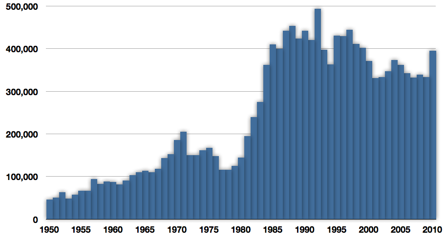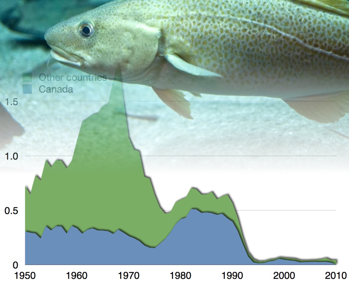 Along Canada’s eastern coast, people fished cod — generally found between 200 and 360 feet — for 500 years. It shaped those communities, and the iconic species was Canada’s largest fishery. It was even referred to as the “Newfoundland currency.” Then cod suddenly collapsed around 1992. (See graph.)