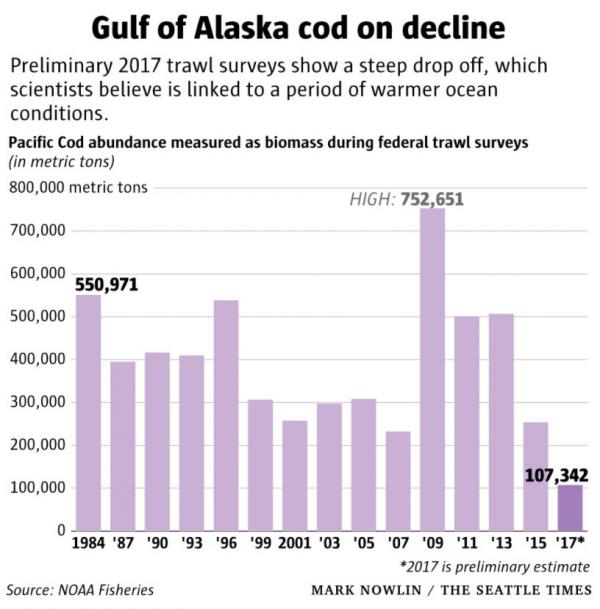 “The Gulf of Alaska cod populations appears to have taken a nose-dive. Scientists are shocked at the collapse and at the starving fish, making this the ‘worst they’ve ever seen.’ The 2017 trawl net survey found the lowest numbers of cod on record forcing scientists to try to unravel what happened. A lot of the cod hatched in 2012 appeared to survive, but by 2017, those fish were largely gone for the surveys, which also found scant evidence of fish born in subsequent years. Many of the cod that have come on board trawlers are “long skinny fish” according to Brent Paine, executive director of United Catcher Boats.