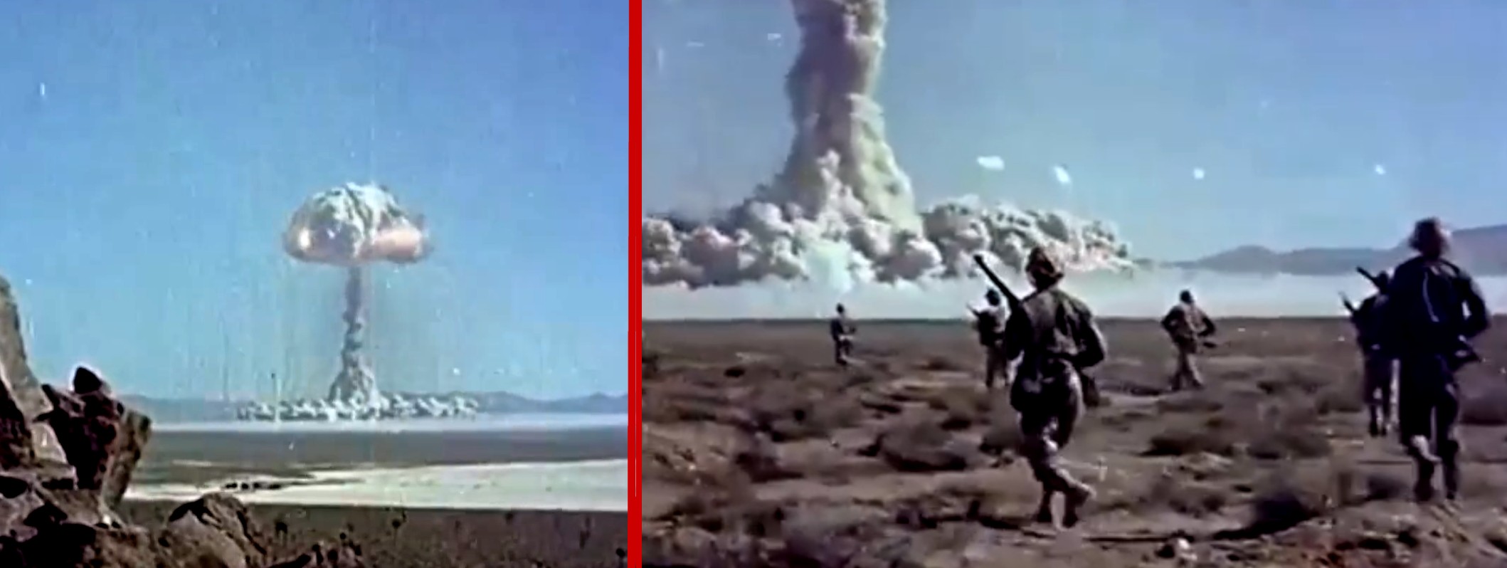Nuclear tests in the 1950s — with soldiers marching into the test zone