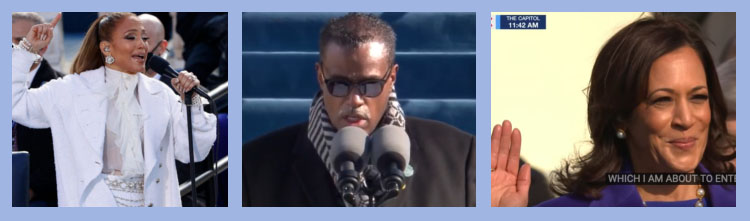 At the 2021 Inaugural: (L) Jennifer Lopez, Photo: Yahoo Life! (C) Rev Dr Silvester Beaman, Photo: MSNBC (R) Vice President Kamala Harris, being sworn in by Justice Sotomayor
