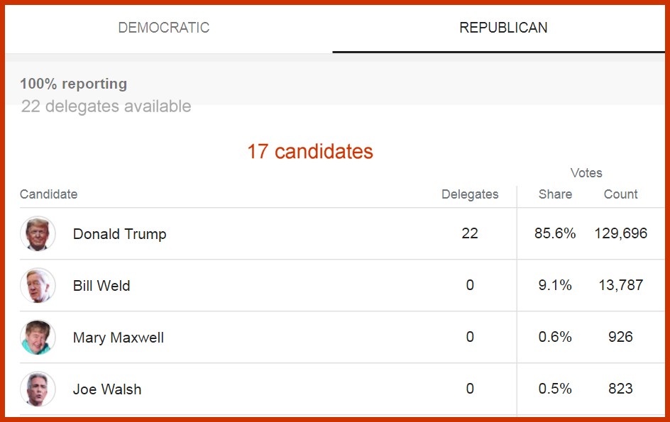 Our beloved candidate, Mary Maxwell, PhD, LLB, did well in yesterday’s election. She came THIRD on the Republican count with 926 votes. Third against a field of 17 candidates. First was Trump, well-known tweeter and sitting President, and second was Weld, ex-governor of Massachusetts.