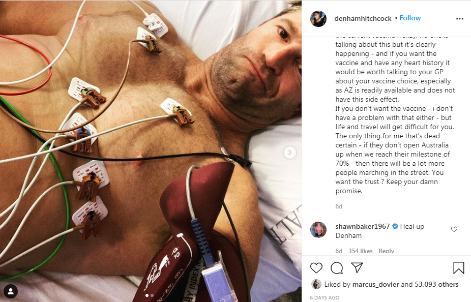 “This is not a post for sympathy – the hospital and staff at the Gold Coast uni hospital have been beyond great and although it’s all new territory I’m told I’ll make a full recovery although I could be like this for months. Thankfully I have the world’s smallest nurse keeping an eye on my ever-present ECG. But my present thought would be – in the current vaccine frenzy, no one is talking about this but it’s clearly happening – and if you want the vaccine and have any heart history it would be worth talking to your GP about your vaccine choice, especially as AZ is readily available and does not have this side effect.