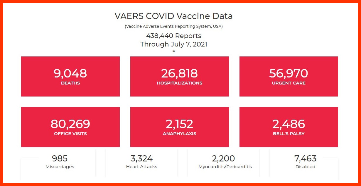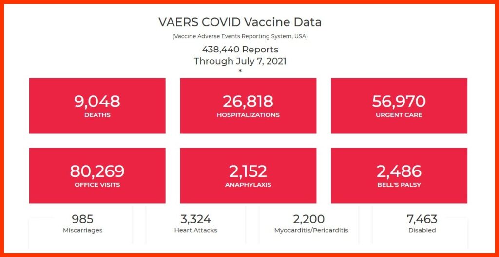 “…the CDC’s own report, last week of over 9,000 Americans dead and over 430,000 adverse events reported to VAERS as of July 8th. This is many more deaths than all previous vaccines combined and these numbers could in reality be much, much higher, according to a 2011 Harvard University study that revealed that cases reported to VAERS may account for less than 1% of actual cases. There’s also the nearly 18,000 dead and nearly 1.7 million officially reported injured on Europe’s EudraVigilance system and double those numbers in Asia and Africa.”