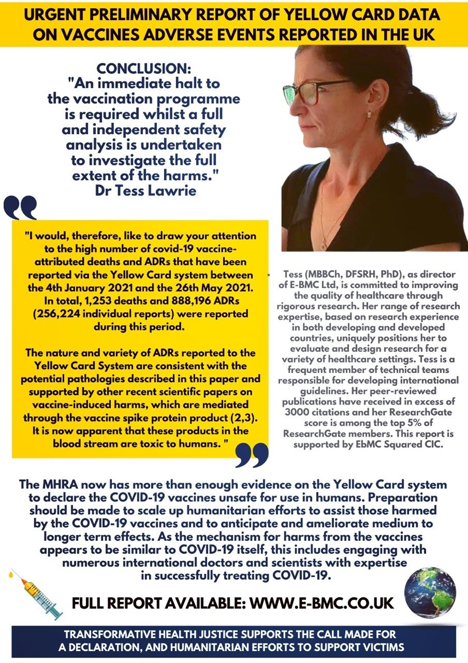 Dr Tess Lawrie runs an agency that does epidemiological reviews of medical studies for the WHO and the government. She recently reviewed the Yellow Card reports for the covid vaccines, and concluded that there are such an alarming number of adverse reactions and deaths that the vax rollout should be stopped.