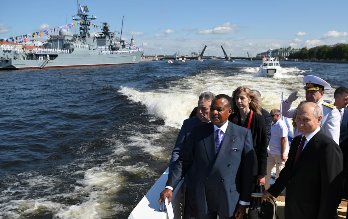 President Vladimir Putin and President of the Republic of the Congo Denis Sassou Nguesso sail a boat during an annual Navy Day parade in Saint Petersburg, Russia, July 30, 2023. Sputnik/Alexander Kazakov/Kremlin