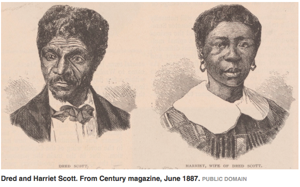 Dred Scott lived in Missouri, a slave state, but his “owner,” Emerson Stanford took him to Illinois and Wisconsin, both free states, then back to Missouri. In 1846 he filed for freedom for himself and his wife on the grounds that he had become free in Illinois.