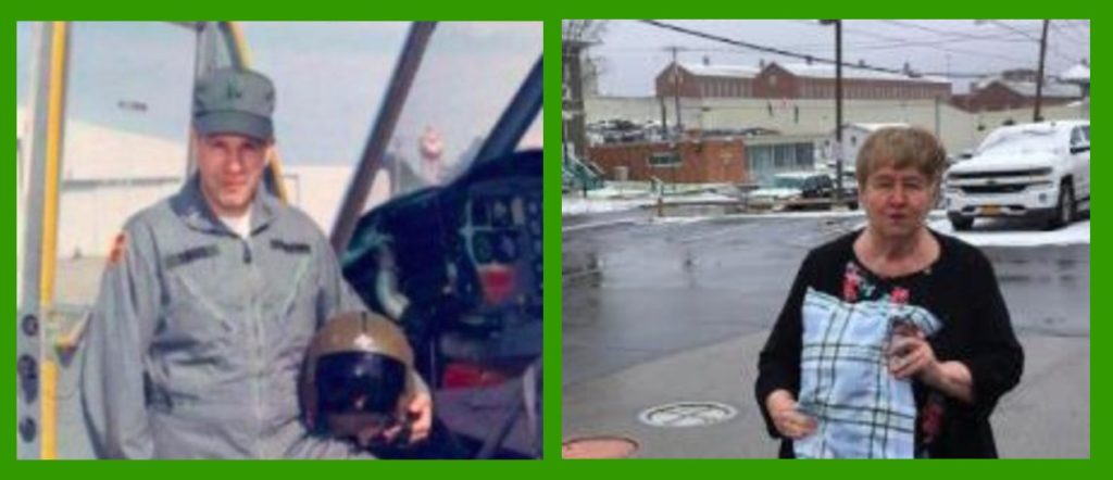 (L) Richard Taus, (R) Mary Maxwell in front of snow-capped Dannemora Prison, holding the offending cushion