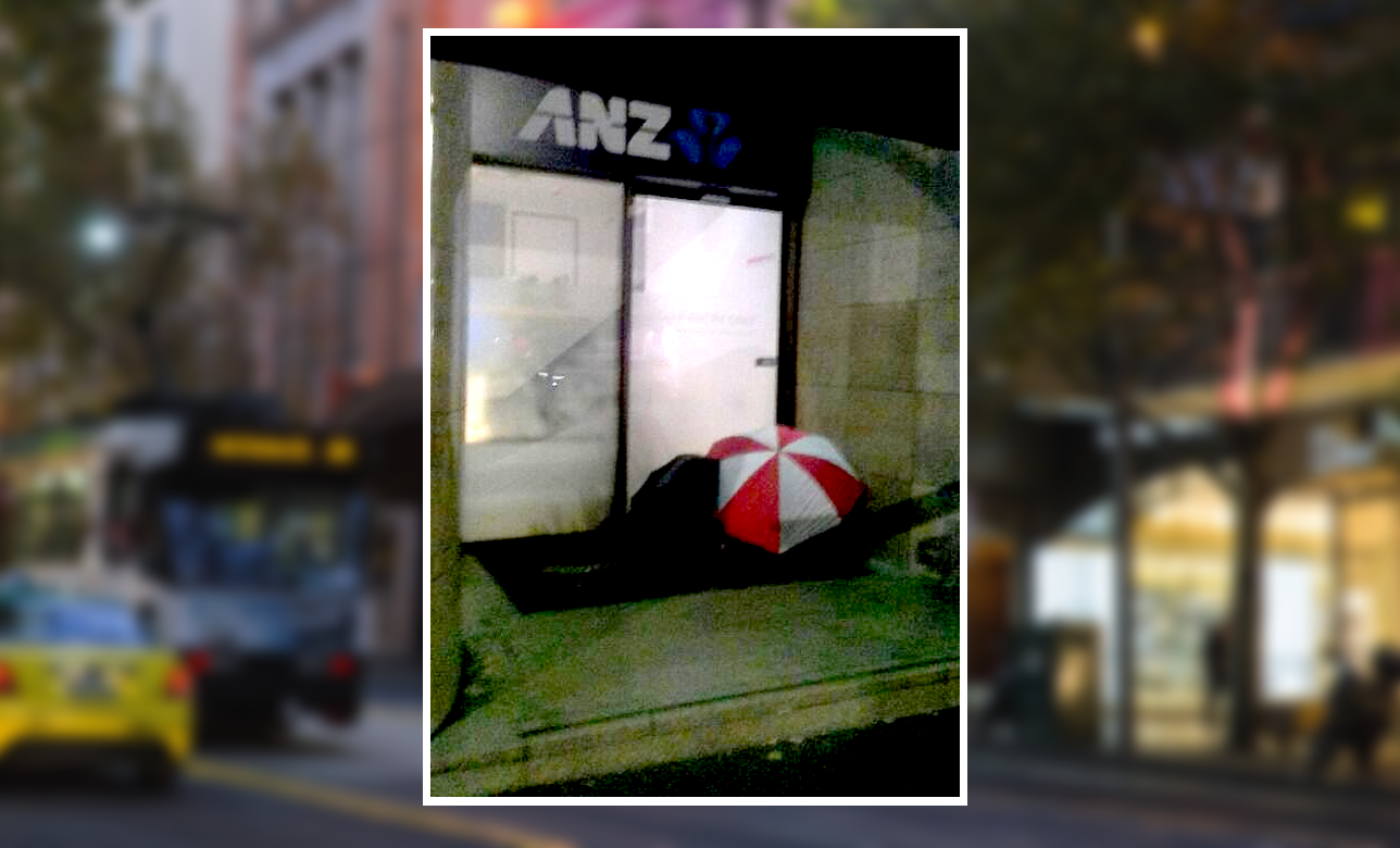 A good picture of the umbrella people taking shelter outside the ANZ bank.