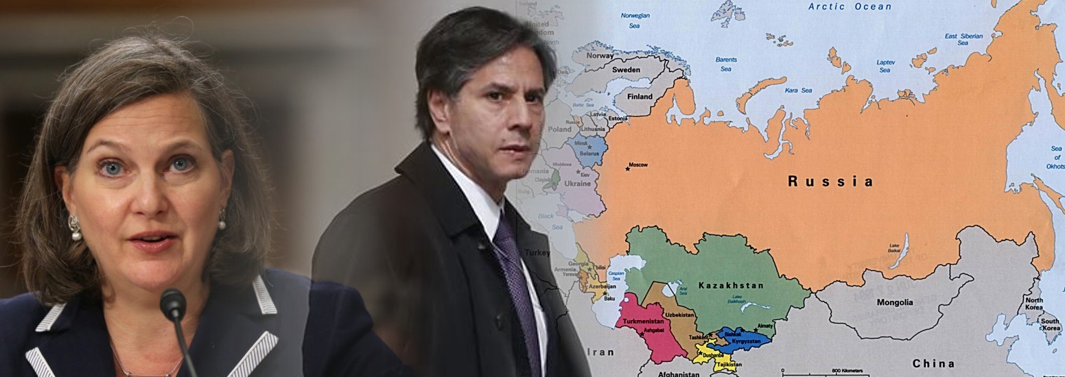 Victoria Nuland, the US Deputy head of State, and by her boss Antony Blinken, (R) map of Russia