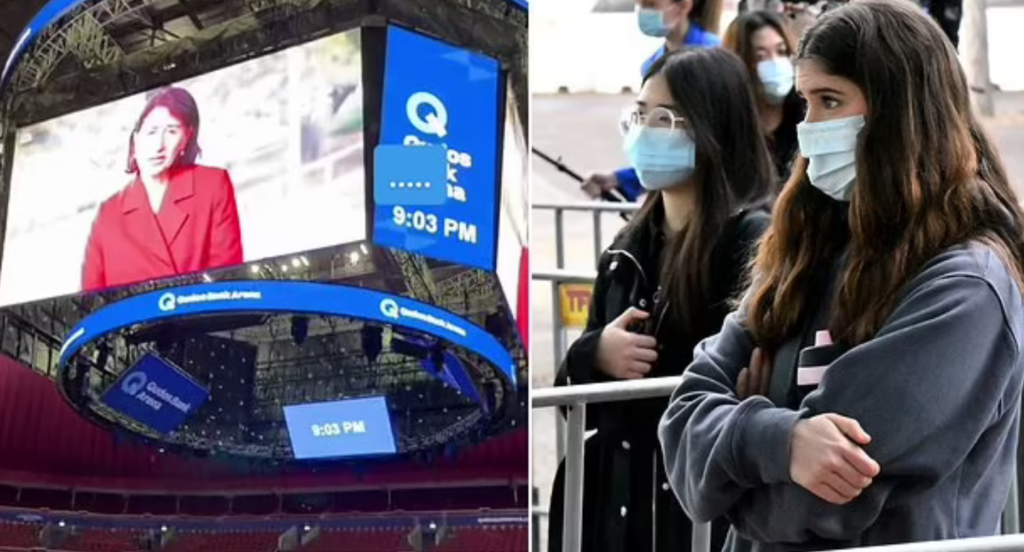 On 9 August 2021, the New South Wales government was “offering 24,000 first-dose vaccination appointments for year 12 students at the Qudos Bank Arena at Olympic Park in Sydney. On 11 August 2021 it was reported that students waiting to get their first dose of the Pfizer jab “have been left creeped out by footage of Gladys Berejiklian playing on giant screens inside the vaccination hub.”
