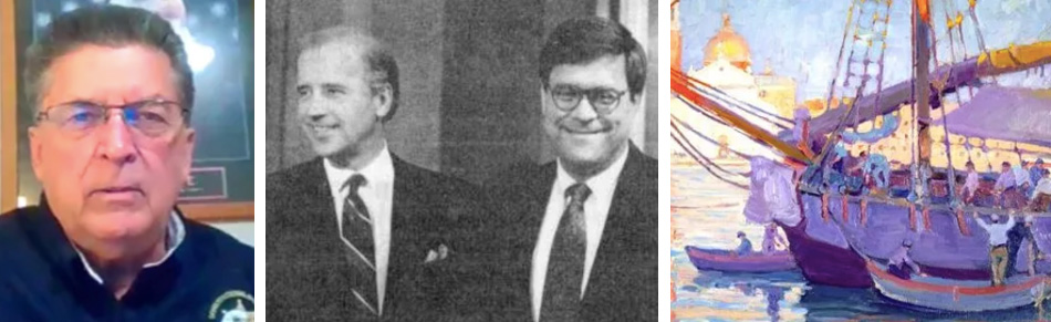 (L) Sheriff Richard Mack, Photo: cspoa.org (C) Joe Biden and Bill Barr, Photo: LyndonLarouche.org (R) The Lagoon, Venice, by Jane Peterson