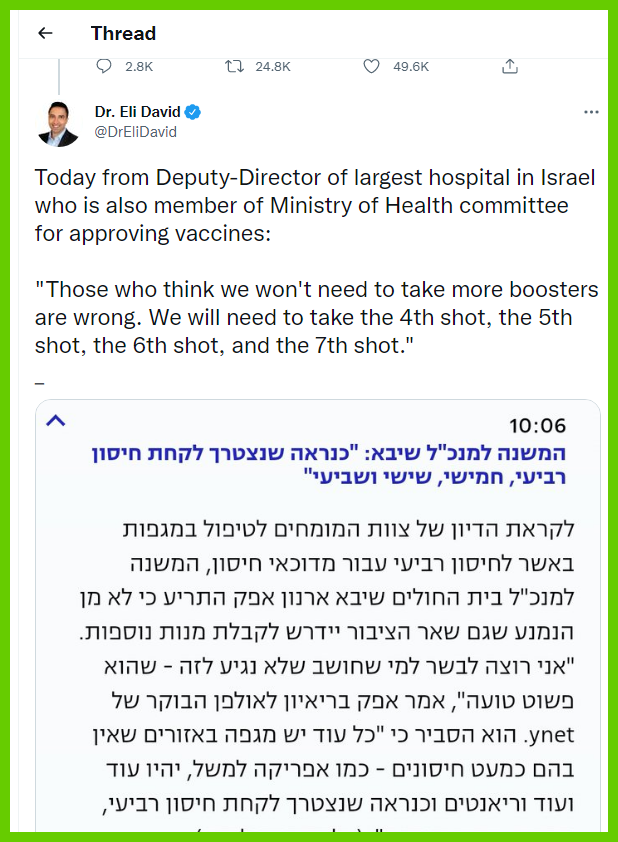 InformationLiberation reports on Israel, “Israeli Health Official Tells Public to Prepare For Endless Boosters: ‘We Will Need to Take The 4th Shot, The 5th Shot, The 6th Shot And The 7th’.” To quote from the article:
